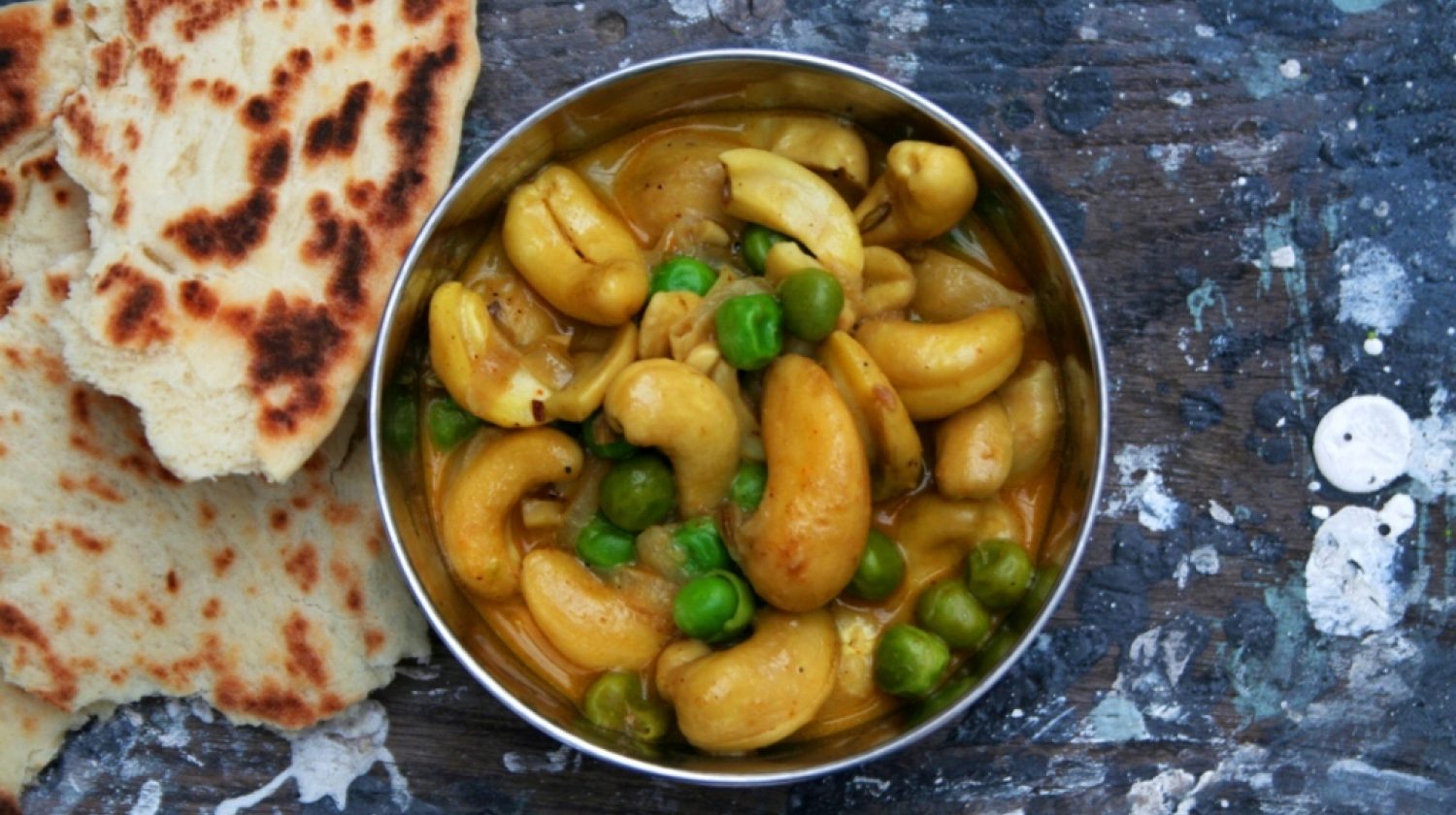 Unlike the cashew nuts in South East Asia, the ones we buy here have been starved of hydration and therefore tend to be parched and dry. Soak them for up to 2 hours to return them back to a refreshed state. Using a skillet or a deep frying pan heat the oil over a medium temperature and slip in the pounded fennel seeds followed by the cinnamon stick, stir for a minute then add the garlic, green chilli and onion and cook until the onion has turned a toffee colour at the edges and the garlic is yielding its aroma. Turn the heat down to low, spoon in the cashew nuts and toss around the pan coating them with the onion and aromatics for a couple of minutes. Tip in the chilli powder, turmeric, cumin and coriander powder and season with salt and sauté for 2 minutes. Pour in the coconut milk and garam masala and simmer for 10 minutes, stirring regularly and you’ll notice the mix will turn a warm yellow ochre, now add the frozen peas and cook for a further 5 minutes making sure the peas remain bright perky and jewel like.