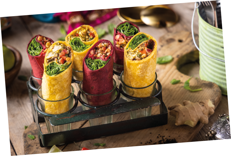 South Asian street food in flavoured flatbreads. Black and golden rice, herbed crunch, bold fillings and juicy chutneys. Handmade, handheld and built for big flavour days.